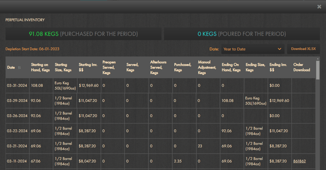 - Date: Data capture runs 24-hours a day and are ingested by various sources (pours, depletions, purchases, etc). The most recent row will appear once a full day of data has been captured. Any time a change in inventory occurs on that specific date, it will appear as a line item in the Perpetual Inventory. If dates are skipped, this means there was no activity for this product on that date. Same day data unavailable and will be shown the following day when all data points have been captured.